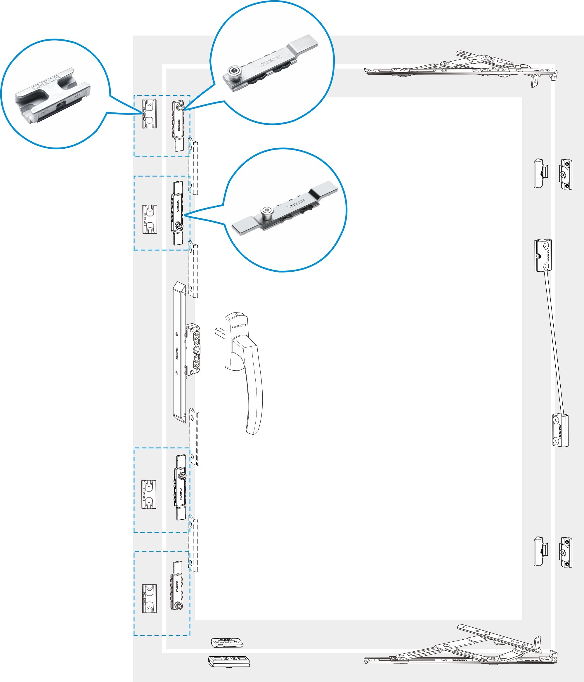 多点锁由锁点、锁座和传动杆组成。作为窗扇和窗框之间的锁定机构,锁座安装在窗框上,锁点安装在窗扇上,一般安装在窗户的开口侧。整个车窗周围散落有锁点和锁座,通过传动杆连接,使车窗更好地密封和安全。